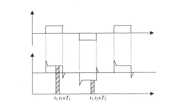 污水處理廢水流量計一般都采用工頻交流電源供電, 其電源電壓的幅值和頻率的變化都會給污水處理廢水流量計帶來電源性干擾噪聲。對電源電壓的幅值變化, 因采用多級集成穩壓, 一般而言電源電壓的幅值變化對電磁流量的測量精度影響不大。當電源電壓的頻率波動時, 雖然其波動范圍有限, 但對污水處理廢水流量計測量精度影響較大。為了解決工頻干擾問題, 實現對流體流速感應電勢eab信號的準確測量, 需利用以下基本關系:①勵磁周期為工頻周期的整數倍, 即勵磁頻率為50/nHz(n為偶數);②正負勵磁下的同相位采樣。圖2是對應低頻矩形波勵磁形式下的典型電勢信號形式, 按上述關系在一個勵磁周期下, 若假設t1 和t2 點為工頻干擾的等效干擾點, 且采樣寬度T=T1 =T2 , 則eab的基本算式為: