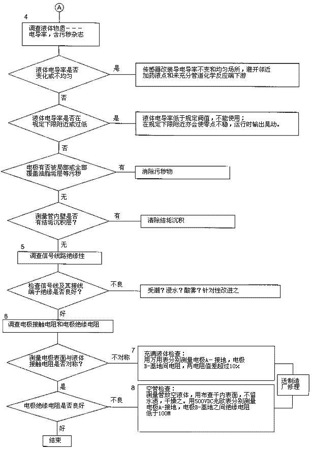 檢查流程圖*5項。信號回路絕緣下降會形成零點不穩。信號回路絕緣下降的土要原因足,包極部位絕緣下降所引起的,但也不能排除信號電纜及其接線端子絕緣下降或破壞。因為有時候現場環境十分嚴酷,稍一疏忽儀表蓋、導線連接處密封不慎,彌漫著潮氣酸霧或粉粒塵埃侵入儀表接線盒或電纜保護層,使絕緣卜降。信號回路絕緣電阻檢查分別按電纜側和流量傳感器側兩郵分進行,用兆歐表測試。因信號電纜容易可先做。流量傳感器再分兩次進行:充滿液體測黽電極表面接觸電阻和個管后測量,U極絕緣電阻。