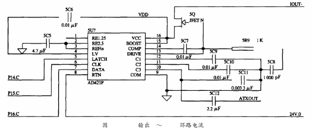 HT2012需要外部提供460.8kHz的時鐘信號,且要求時鐘頻率的誤差是0.1%,若直接入一個460.8kHz的晶振不僅會引起系統功耗的增加,而且該晶振屬于非標準晶振,需專門定制。為了解決這一問題,在系統中采用一片1.8432MHz的晶振以產生時鐘信號,再經分頻器CD4013進行4分頗,可輸出1.8432MHz/4=460.8kHz的分頻信號供HT2012使用。AD421其內部的電壓調節器與外部的場效應管DN25D對輸入到AD421的電壓進行調整,可提供+3.3V電壓作為其他設備的電源。HART發出的FSK信號,經過一個電容耦合送到AD421中,轉換成相應的0.5mA正弦電流信號,實現電壓信號到電流信號的轉換,同時,疊加在4~20mA的電流上送給接收設備,實現了HART協議的信息的交換。本電路耦合電容取為0.0033μF,如圖5所示。