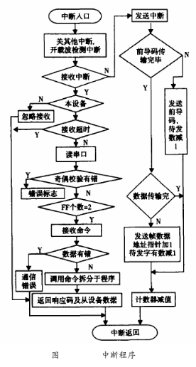 在HART通信中,地下污水流量計作為從設備進行通訊,所以這里的軟件設計只是針對于從設備。HART通信采用水平和垂直校驗的方法。當檢測到接收數據有差錯時,則等到主設備命令幀發完后,通知主設備數據接收有誤。主設備則重新發命令幀,從而保證通信的準確可靠。HART中斷子程序流程圖如圖6所示。由于HART通信為主從方式,HART幀中每個字節在物理層傳輸需要9ms左右,為了保證通訊的實時性,通訊程序采用串行口終端接收/發送。該中斷所要完成通信中的主要任務,即接收和發送幀,幀的拆分和打包。