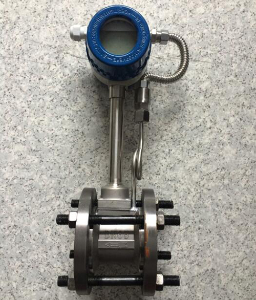 2、溫度補償一體型渦街流量計還帶有溫度傳感器,可以直接測量出飽和蒸汽的溫度并計算出壓力,從而顯示飽和蒸汽的質量流量。