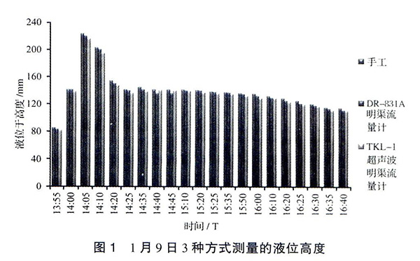 見圖3,以手工實(shí)測液位高度為基準(zhǔn),2種流量計的誤差均在±5%的范圍內(nèi)。除在1月9日14∶40和14∶45兩個時間點(diǎn)測量值表現(xiàn)出DR-831A測量誤差高于TKL-Ⅰ外,其他時段都明顯表現(xiàn)出DR-831A測量誤差小于TKL-Ⅰ。