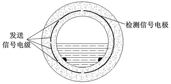 ③利用阻抗或信號衰減研制的非滿管一寸管污水流量計。這種結構的非滿管一寸管污水流量計是當前國內研究的方向之一。其結構是流量管底部貼一對信號發(fā)射電極,在流量管中間貼信號接收電極。由于信號在流體中傳播會產(chǎn)生衰減,且傳播時間越長,衰減越多,因此通過信號接收電極接收到的信號衰減量即可得知液面高度;同時該電極還能測量流體切割磁感線產(chǎn)生的電動勢,以此達到測量非滿管流量的目的。阻抗式或信號衰減非滿管一寸管污水流量計結構簡圖如圖5所示。