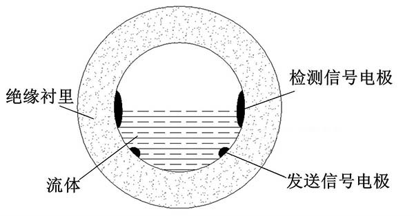 ①多電極式非滿管一寸管污水流量計。其底部是一對信號注人電極,中間有多對測量電極,頂端有一個滿管電極。在滿管情況下,該流量計與普通的一寸管污水流量計的功能相同,滿管情況下流體的橫截面積是固定的,此時計算流量值只需要測量流體的流速即可。當流體非滿管時,滿管電極檢測到管道非滿狀態(tài),利用算法修正測量值,此時流量計的測量方式改成測量流體流速和液面高度。信號注人電極與在不同位置的三對測量電極共同工作,用于測量液位面的高度和流體的速度。多電極式非滿管一寸管污水流量計結構簡圖如圖3所示。