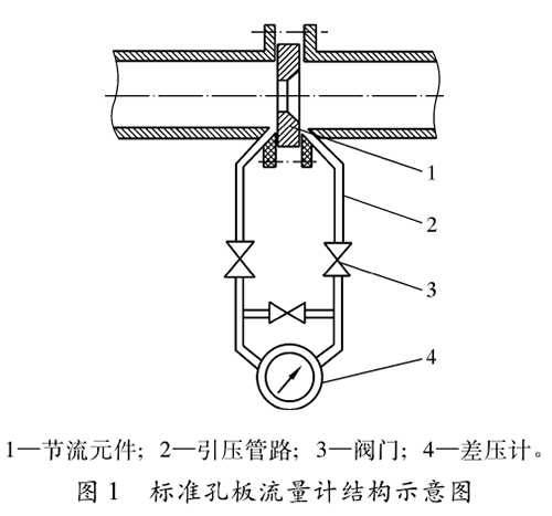 標(biāo)準(zhǔn)管道煙氣流量計(jì)結(jié)構(gòu)如圖1所示,包括節(jié)流元件(標(biāo)準(zhǔn)孔板及其取壓裝置)、傳輸壓差信號(hào)的引壓管路、閥門(mén)以及差壓計(jì)等部分。標(biāo)準(zhǔn)孔板是壓差測(cè)量時(shí)的一次元件,人們利用它在管道內(nèi)使流體產(chǎn)生壓差,再通過(guò)引壓管路把孔板前、后產(chǎn)生的壓差傳送給差壓變送器,再輸人到二次儀表,從而顯示出管道內(nèi)流體的靜壓、壓差、瞬時(shí)流量和累計(jì)流量等計(jì)量參數(shù)。