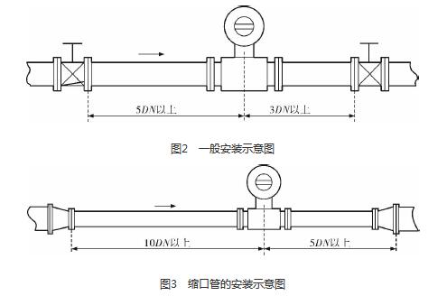 油田污水流量計(jì)廠家的安裝質(zhì)量對(duì)其測(cè)量結(jié)果的影響較大,因此在安裝時(shí)需要注意幾個(gè)問(wèn)題。*先,油田污水流量計(jì)廠家直管段的選擇在配管時(shí)一定要按照要求進(jìn)行選擇,一般選擇流量計(jì)通徑與工藝管道通徑相同,即可滿足工程需要,而且安裝方便、壓力損失小,流量計(jì)直管段上游側(cè)的長(zhǎng)度不少于5倍工藝管道直徑,下游側(cè)的長(zhǎng)度不少于3倍工藝管道直徑(圖2)。但在流速太慢而又要求精度較高或需要變徑的應(yīng)用場(chǎng)合,可選擇通徑小于工藝管道通徑的流量計(jì),以提高測(cè)量精度,此時(shí)流量計(jì)上、下游必須加裝異徑管,且進(jìn)口異徑管上游側(cè)應(yīng)有長(zhǎng)于10倍工藝管道直徑的直管段,下游側(cè)應(yīng)有長(zhǎng)于5倍工藝管道直徑的直管段(圖3)。