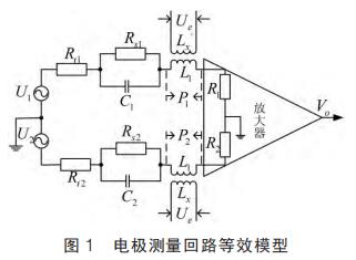 提出在硬件電路上加入模擬開關(guān), 干擾尖峰到來時斷開模擬開關(guān)避免干擾進入后級電路,尖峰過去重新打開模擬開關(guān);K.Saito 等提出漂移校正法,先以高勵磁頻率進行勵磁,在勵磁過程中插入低勵磁頻率提取用于漂移校正的非固定微分噪聲分量,但在插入的低勵磁頻率段漿液噪聲較大且很難將漿液噪聲與流量信號分離,此時的校正因子非單純的非固定噪聲分量,改進措施是長時間取平均值得到穩(wěn)定因子。 傳統(tǒng)方法是同步采樣保持法,即在磁場穩(wěn)定階段采樣。 其他消除干擾的方法有設(shè)置干擾補償機構(gòu)、控制勵磁電流變化率減小干擾幅值、矩形波代替梯形波、希爾伯特黃變換結(jié)合傅里葉變換和程控增益技術(shù)等。經(jīng)上述對現(xiàn)有的文獻分析與總結(jié)可知, 當(dāng)前消除微分噪聲主要從信號處理方面入手,并未對影響噪聲的因素加以研究。 本文建立電極測量回路等效模型,給出仿真模型搭建、參數(shù)取值和仿真結(jié)果分析。