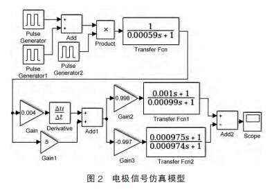 本文基于 Matlab 中 Siumlink 對電極信號進行仿真,勵磁方式為三值波勵磁,勵磁頻率 f=25Hz,傳感器參數(shù) D=40mm、Rx=88.8Ω、Lx=162mH,勵磁系統(tǒng)參數(shù) Ue=100V、穩(wěn)態(tài)電流 I0=200mA。基于電極測量回路搭建的仿真模型如圖 2 所示,圖中信號模塊 pulsGenerator 通過加法器、乘法器得到勵磁電流。由公式(1),在固定流速下感應(yīng)電勢與勵磁電流成正比,通過增加 Gain1 模塊得到感應(yīng)電勢信號。 對勵磁電流進行求導(dǎo)即經(jīng)模塊 Derivative 得到微分噪聲, 其中 Gain 值與 Lx 和 L1 相關(guān)。 感應(yīng)電勢與噪聲經(jīng)Add1 疊加之后得到電極信號 E1(t)。 scope 觀察輸出信號波形。仿真波形和真實波形如圖 3 所示。 將傳感器參數(shù)代入到勵磁電流穩(wěn)態(tài)調(diào)節(jié)時間公式中,得電流上升時間為 360μs,測得實際上升時間為 390μs,兩者相差不大,驗證了仿真模型的正確性。