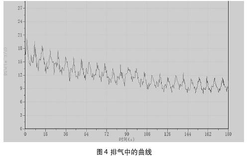 圖4、圖5中所示曲線為測(cè)量過程中所截取的集流傘中所聚集的氣相,通過排氣通道排出時(shí)與排出后的測(cè)量曲線。測(cè)試過程中錄取到的儀器排氣的過程,當(dāng)集流傘完全支開后仍需要開啟流量測(cè)試進(jìn)行實(shí)時(shí)檢測(cè),否則可能會(huì)錄取資料失真。