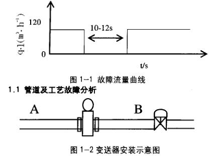 被測液從A流向B(如圖1-2),傳感器水平安裝,電極水平,傳感器下游2m處裝有調節(jié)閥,從圖中可以排除由于傳感器中急劇潴留氣和傳感器后無背壓等情況導致的測量脈動情況產生。