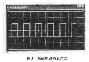 其中,Vp2是P2端口輸出電壓幅值的絕對值,此處應該是+24V。整個電路是對稱的,且R15=R20,當P2.9為低電平,P2.8為高電平時,P2的端口2無電壓輸出,端口1輸出+24V的電壓,Vref(+)值不變,如此周而復始輸出頻率為6.25Hz的的雙極性矩形波。用Multisim仿真結果如圖3所示。