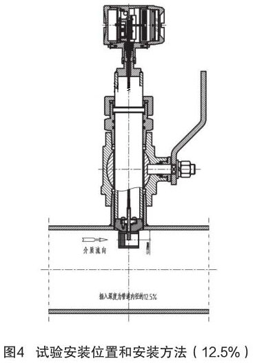 根據(jù)中華人民共和國機械行業(yè)標準:JB/T9249-2015《煙氣流量計》進行插入式煙氣流量計的研制與設計。在試驗過程中,因為理論研究不充分,再加上經驗不足,采用插入深度是按照以往其它產品(插入式電磁流量計)的經驗,以插入深度為現(xiàn)場管道內徑的 12.5% 進行試驗,其對介質流量的檢測值與同種規(guī)格管道法蘭式結構的煙氣流量計進行比較,偏差值較大、儀表準確度無法滿足設計要求。試驗安裝位置和安裝方法如圖 4 所示。