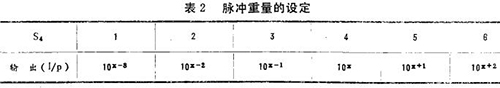 脈沖重量設定用S4插頭選擇進行,它的設定有一定的條件,這些條件是脈沖輸出的類型、脈沖寬度和刻定常數。并且它的選擇范圍還要依據脈沖寬度和*大測量流量-口-口口-l0的X方(m3/h)來確定。其系數-(數字同*大流量m3/h)由*大流量的前三位有效數定決定,而對應于“x”值的脈沖重量(l/p)見表2。