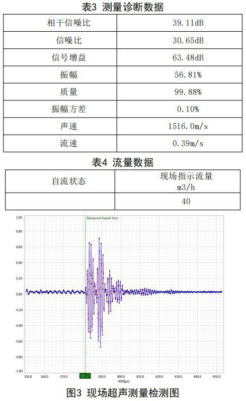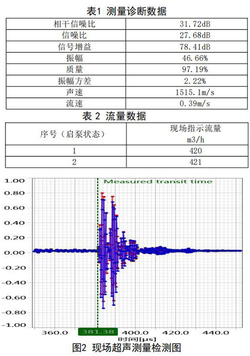 在高負(fù)荷段采用泵送補(bǔ)給水狀態(tài):測試時(shí)間 2018年10月11日,采用德國FLUEX高精度外夾式超 聲波流量計(jì)作為標(biāo)準(zhǔn)流量計(jì),測量基礎(chǔ)數(shù)據(jù):管道 外徑276.93mm,管壁厚度12.40mm,采用兩聲程169mm傳感器安裝距離,通過對超聲波流量計(jì)信號(hào) 分析與診斷(數(shù)據(jù)見表1、表2和圖2),診斷數(shù)據(jù) 提示標(biāo)準(zhǔn)超聲波流量計(jì)測量狀況佳,檢測開始,啟 動(dòng)補(bǔ)給水泵,運(yùn)行一段時(shí)間流量穩(wěn)定后,測量結(jié)果 如下: