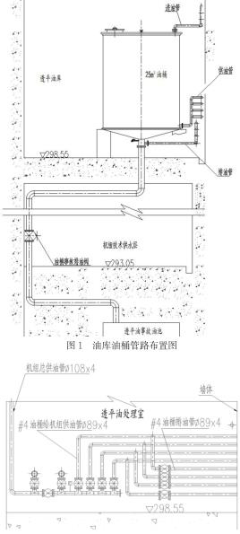 透平油油庫(kù)及油處理室設(shè)置在發(fā)電機(jī)出線(xiàn)層。油庫(kù)中安裝4個(gè)油桶,單個(gè)油桶容積為25m3。按照功能劃分為2個(gè)運(yùn)行油桶,2個(gè)凈油桶。每個(gè)油桶ding部設(shè)置一根油桶進(jìn)油管,油桶下部設(shè)置一根給機(jī)組供油管,油桶底部設(shè)置一根事故排油管,經(jīng)事故排油閥引入事故油池中,事故排油管上引出一根油桶排油管。各油桶的進(jìn)油管、供油管、排油管分別引入油處理室中。具體布置形式可見(jiàn)圖1所示。油處理室中設(shè)置一個(gè)容積為1m3的移動(dòng)油箱,用于向設(shè)備添油或臨時(shí)儲(chǔ)油。