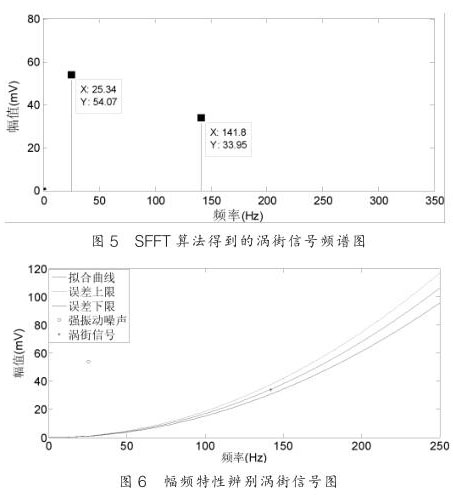 從圖 5 可以看出 SFT 算法能夠很好恢復,對渦街信號的頻率恢復沒有誤差,而幅值的誤差不超過 1% ,這對含有強振動噪聲的渦街信號精確測量至關重要;圖 6 是經 SFT 頻譜分析所得到的數據通過幅頻特性曲線來辨別是噪聲信號還是渦街信號。通過幅頻關系的信號處理方法可以從含有振動的混合信號中識別渦街信號,從而達到提高液化氣流量計抗振動性能的目的。