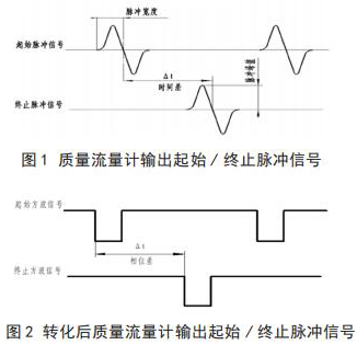 插入式電磁流量計流量與相關測試設備連接起來,就可以進行插入式電磁流量計的校準,時間差△ t 由專用試驗測試設備可以測出。起始脈沖信號和終止脈沖信號如圖 1 所示。經過專用試驗測試設備信號轉化后的信號方波如圖 2 所示。