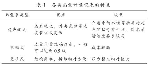目前供熱行業內使用的熱量計量儀表按工作原理主要分為超聲波式、 電磁式、 差壓式, 其特點見表 1 。 熱量計量儀表按結構可分為一體式和分體式, 一體式熱量表將一支入口或出口溫度傳感器嵌入到流量傳感器管道中, 并配有專門的計算器進行熱量計算; 分體式熱量表采用單獨的流量傳感器, 包括超聲波流量計、 電磁流量計、 差壓流量計、瀝青流量計等, 溫度測量采用單獨的鉑電阻溫度計或溫度變送器測量供回水管道溫度, 再配備熱量積算儀進行溫度和流量信號采集得到熱量值。