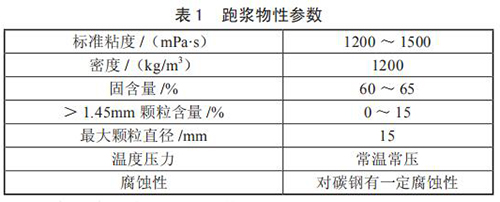 對(duì)跑漿進(jìn)行分析后發(fā)現(xiàn),跑漿是一種由煤漿和一些雜質(zhì)混合而成的半流體物質(zhì),當(dāng)管道蒸汽流量計(jì)使用煤倉(cāng)中煤堆中上部煤時(shí),由于煤質(zhì)較好,跑漿中小煤塊極少,性質(zhì)同正常煤漿,只是固含量稍高;而使用煤堆底部的煤時(shí),煤質(zhì)差管道蒸汽流量計(jì)研磨不充分,跑漿中含有約 15% 的小煤塊,分析后的跑漿物質(zhì)參數(shù)如表 1 所示。