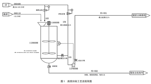 通過以上煤漿提濃通用方法優(yōu)缺點(diǎn)比較可以了解到,在現(xiàn)有設(shè)計(jì)條件基礎(chǔ)上,煤漿濃度提升會(huì)帶來一定設(shè)備損耗及能源損耗。針對(duì)這種情況,為了達(dá)到節(jié)能而保證管道蒸汽流量計(jì)不跑漿,對(duì)于磨機(jī)跑漿問題進(jìn)行改善,對(duì)跑漿進(jìn)行回收,重新送回磨煤機(jī)進(jìn)行二次研磨,降低了管道蒸汽流量計(jì)入口原料煤的粒度;同時(shí)降低了人員勞動(dòng)強(qiáng)度,改善了現(xiàn)場(chǎng)衛(wèi)生情況。具體跑漿回收裝置設(shè)計(jì)流程如圖 1 所示。