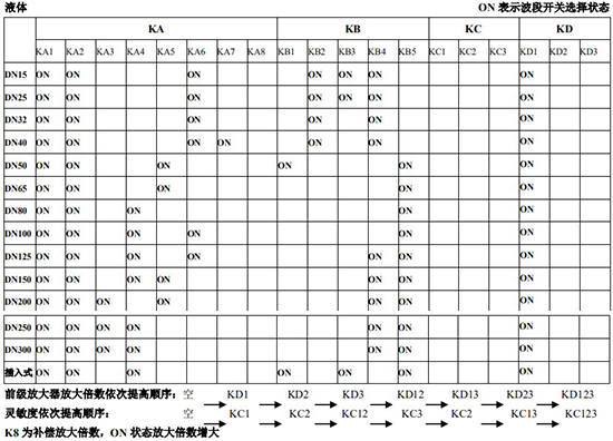 RG=1-F 調(diào)放大器增益,由 1 至 F 依次增大(常用 4-8);RS=1-F 調(diào)觸發(fā)靈敏度,由 1 至 F 依次提高(常用 4-8)不同口徑和介質(zhì)開(kāi)關(guān)選擇參見(jiàn)附表。并根據(jù)實(shí)際信號(hào)先調(diào)整 K2 和 K3 擴(kuò)展頻帶,必要時(shí)調(diào)整 K1 電荷放大器增益