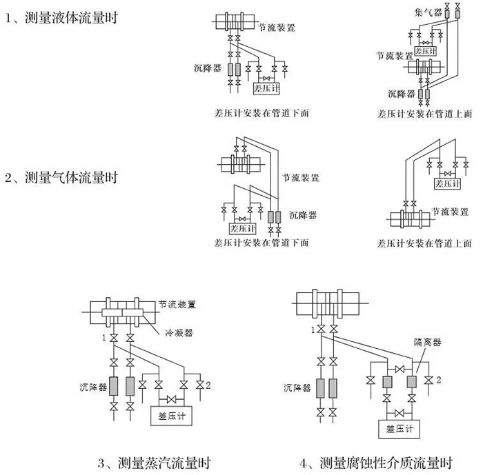 根據(jù)被測介質的性質、節(jié)流裝置與差壓計的相對位置,差壓信號管路可有以下幾種安裝方式:
