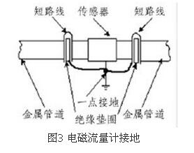 由于一體式污水流量計價格的測量感應(yīng)電壓很小,電壓較低,易受外界電磁噪聲的影響,故在安裝時應(yīng)進行可靠的接地連(跨)接。金屬管道一體式污水流量計價格接地連(跨)接方法如圖3所示。